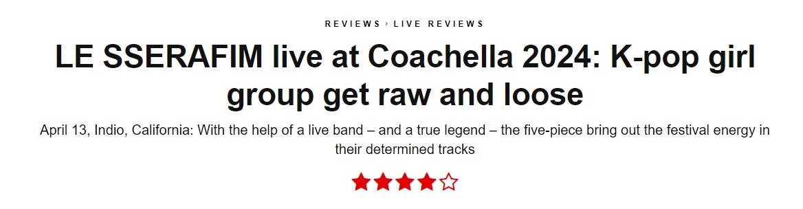 英國音樂雜誌《NME》標題寫道《K-POP 女團毫無顧忌、自由奔放的舞台》,「LE SSERAFIM 在出道 2 週年之際,成為最快受邀科切拉演出的韓國藝人,這反映了 5 名成員在音樂界產生的影響力。LE SSERAFIM 正在開拓自己的道路,看着所有人都緊握雙手站成一排向觀衆打招呼,就會知道這個組合能夠征服『科切拉』的力量來自彼此依靠」,給予舞台 4 星評價,並補充「LE SSERAFIM 在 40 分鐘內將 Sahara 舞台變成了自己的」。