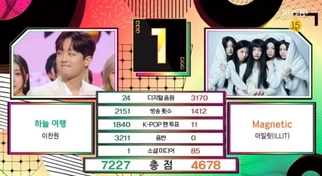 在本週(05.03)播出的《音樂銀行》,TROT 歌手李燦元憑藉迷你二輯主打歌《天空旅行》擊敗女團 ILLIT,首度拿下音樂節目一位,也是 TROT 歌手相隔 17 年再奪《音樂銀行》一位 。