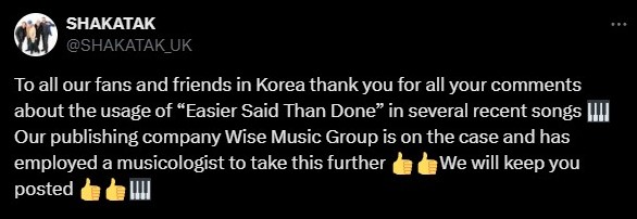 直到近日事件曝光,Shakatak 於 X 平台發文感謝關注事件的粉絲和朋友,透露音樂公司正在處理此案,並已委託一位音樂專家來解決這個問題,有進一步消息會再公開。