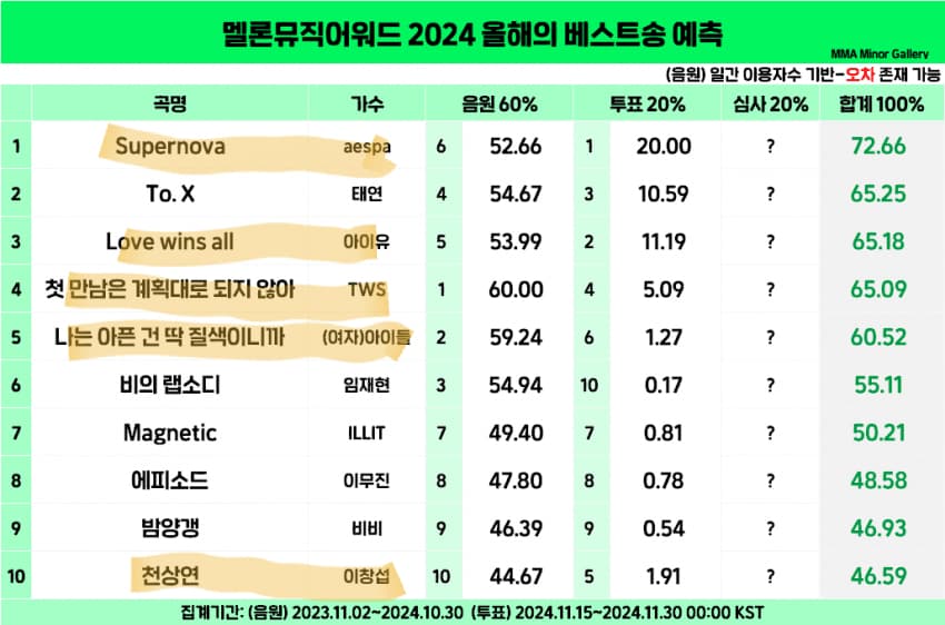 外界先前對「TOP 10」進行預測,縱使太妍投票(20 %)成績不濟,但加上音源(80 %),綜合成績排名第 8 的她,完全可以獲得該獎。隨後有網友指出,2022 年也出現同樣情況,被排除之外,引發結果不公討論。