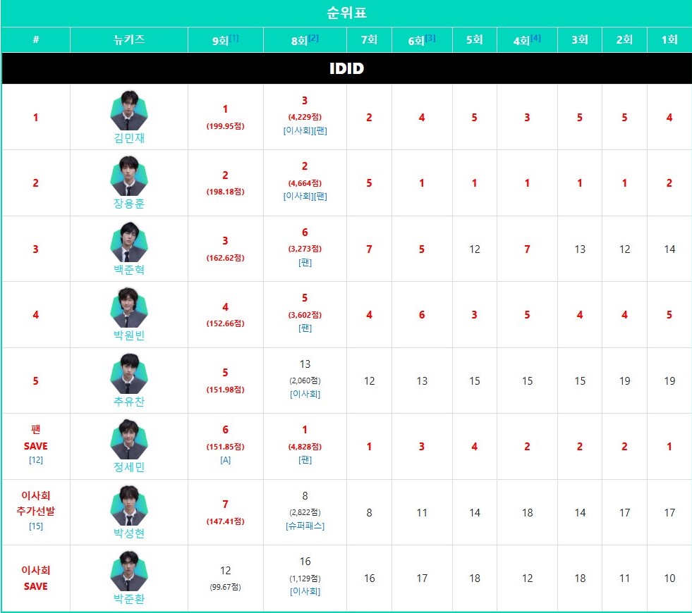 金珉載(김민재)以首名姿態出道,接著依次分別是張龍勳(장용훈)、白俊赫(백준혁)、朴元彬(박원빈)、秋有燦(추유찬);粉絲 SAVE 第二得票者 – 鄭世民(박준환);理事會 SAVE – 朴俊煥(박준환);理事會追加選拔 – 朴城炫(박성현)。(具體分數請看圖片~)