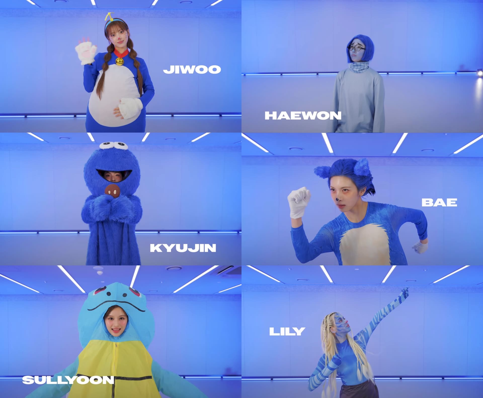 NMIXX 官方頻道公開〈Blue Valentine〉「藍角色版本」練習室影片,全員爆笑變裝登場。Lily 化身《阿凡達》的納美人、Jiwoo 變身哆啦A夢、Bae 為音速小子、Kyujin 扮演《暖暖日記》暖暖、Haewon 為《腦筋急轉彎》角色「憂憂」,而 Sullyoon 原本選的是《寶可夢》的果然翁,最後改成傑尼龜造型。