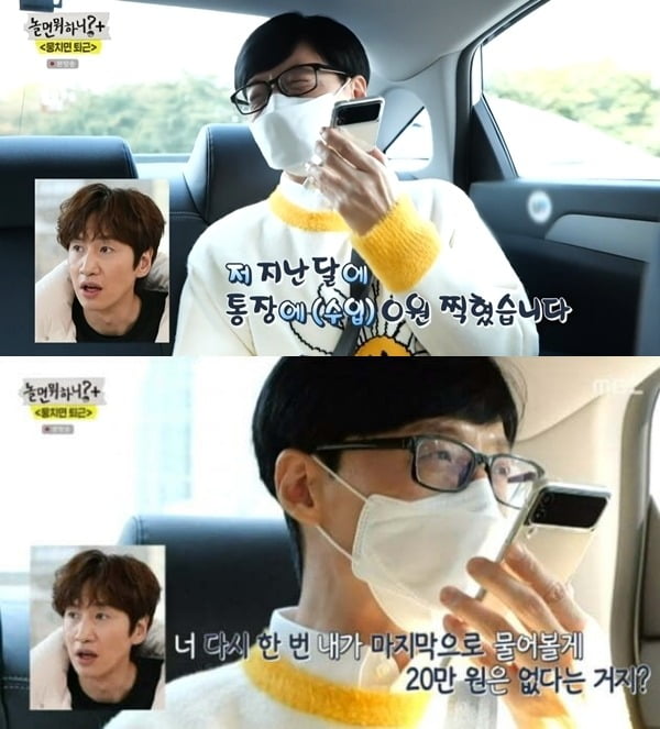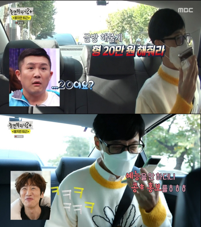 被 Joseph 拒絕後,又到下一個好欺負的對象 – 李光洙。劉在錫向光洙說,借我 20 萬韓元吧。李光洙表示上個月存折顯示收入為 0,超慘的說是十年來第一次。因為上月收入為 0 所以借不出錢 XDD。劉在錫當場被這兩個不可靠弟弟氣得說不出話。