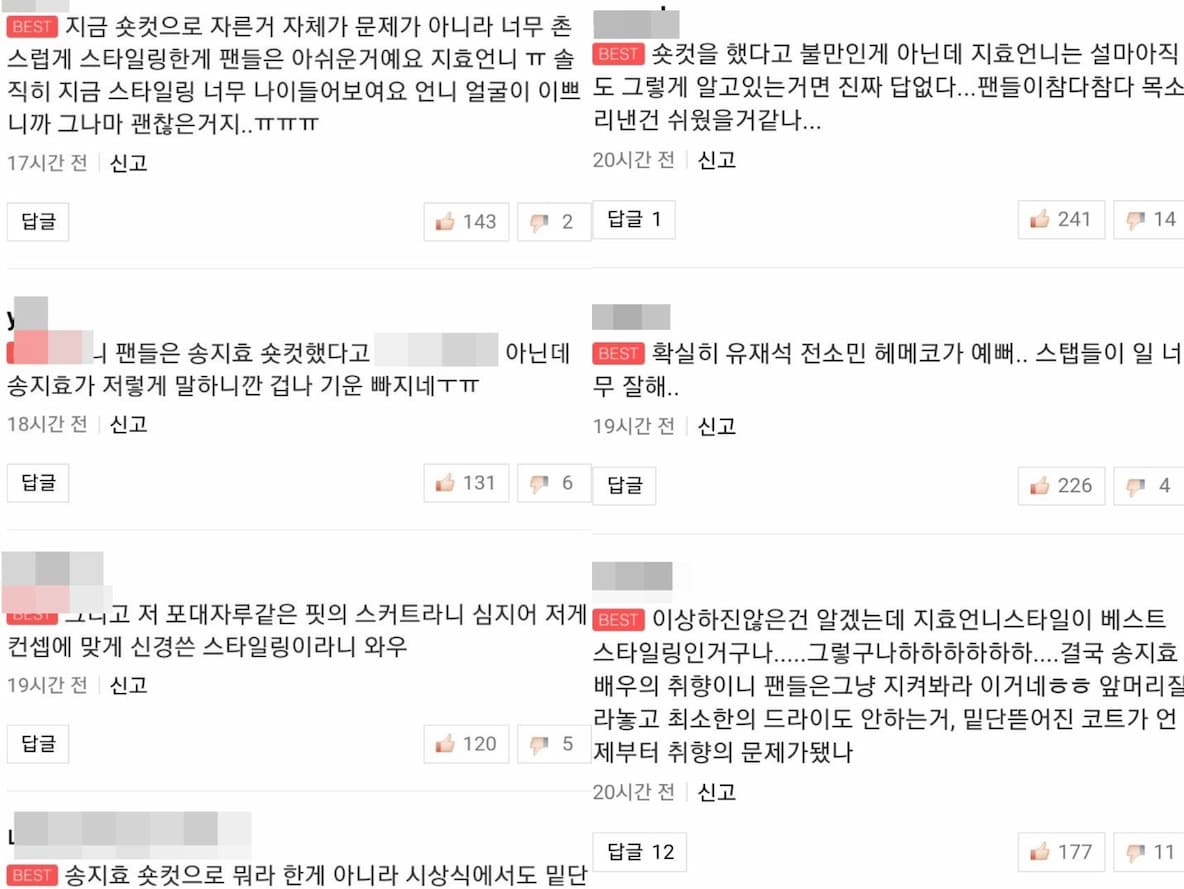 但是看到節目的宋智孝的粉絲們在 NAVER TV 底下留言「我們並不是說短髮,而是對之前造型搭配感到失望,說實話造型顯老」,「宋智孝那樣說讓我泄氣」,「說的是在頒獎禮上給穿破爛衣服的造型師」,表達出遺憾之情。也有人留言斥粉絲過度干涉,宋智孝應該也很生氣吧。
