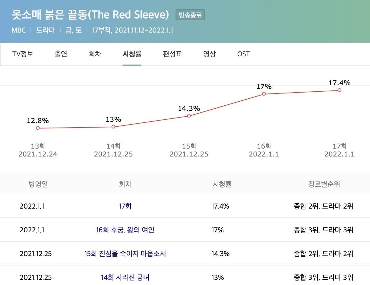 由李俊昊和李世榮主演的 MBC 電視劇《衣袖紅鑲邊》,在昨日晚連播兩集,收視突破 17 % 完美收官。好成績讓劇中演員知名度大增,女主角李世榮還被封為「史劇女王」。早前 MBC 社長在發表會表示「收視超過 15 %就獎勵全體旅行」,如今將會一一兌現公約。