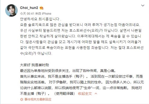 對此,崔時訓今天凌晨在開設沒幾天的發文回應,還貼心地用翻譯器翻譯成中文,聲稱自己從來沒當過牛郎(鴨子),一切都是不實的爆料,並且願意賭上性命來證實自己的清白。