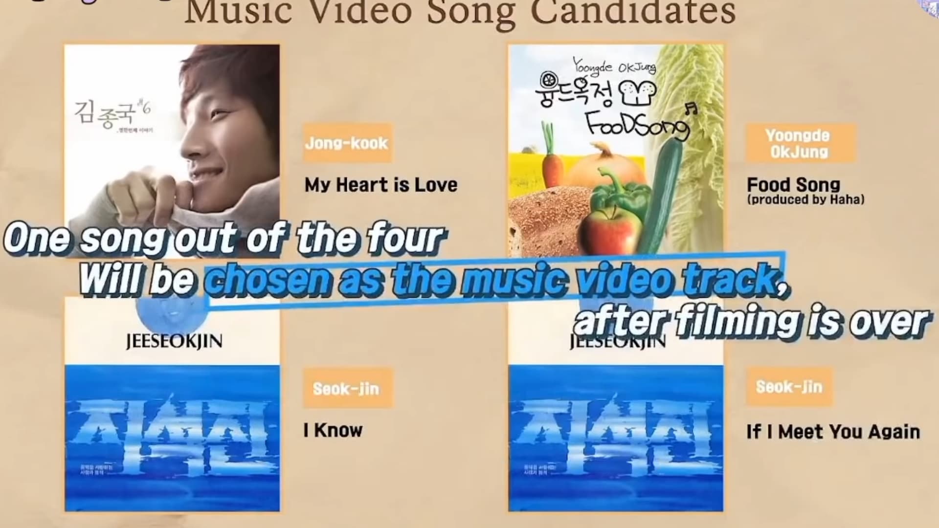 另外製作組還表示,不是選了歌才拍攝,而是拍攝了才抽籤選歌,歌曲候選分別有金鍾國《My Heart is Love》、絨衣玉靜(HAHA 媽媽)《FOOD SONG》、池錫辰《I KNOW》&《If I Meet You Again》。