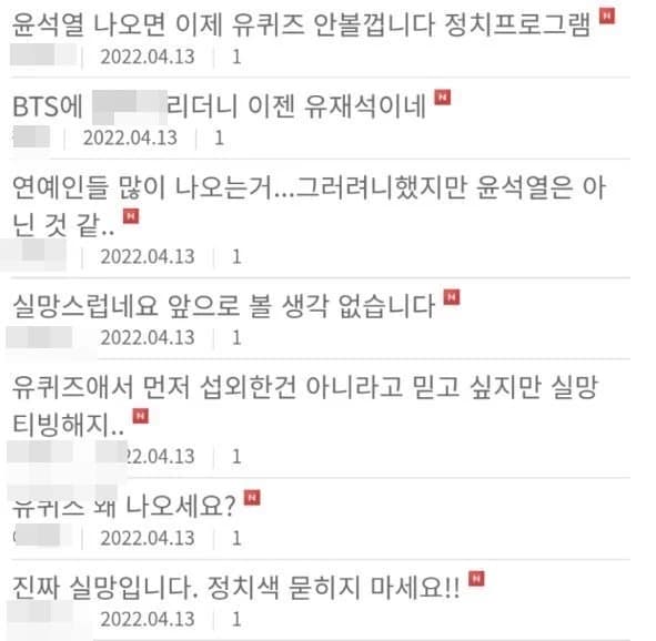 不過,韓國觀眾和網友紛紛對這次邀請出演表示反感,湧入留言板抗議,「不要沾染政治色彩」、「好失望」、「不要出u-quiz,去國政節目或…」、「繼 BTS 之後,這次是劉在錫嗎」。