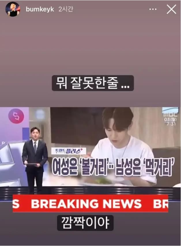 其實這並不是 Key 第一次出現在社會新聞,但每次亮相都是那麼地與眾不同。今年年初社會新聞以關於「宅男宅女消費觀變化」主題進行了報道,新聞中用的資料片段是 Key 在《我獨自生活》做飯、吃飯的畫面,還配上了「女性偏愛視覺享受,男性追求味道」的字幕,引發了不小的話題。看到該新聞報道的 Key 還特意發了INS,自嘲「我還以為自己做了什麼錯事呢,嚇死我了」。