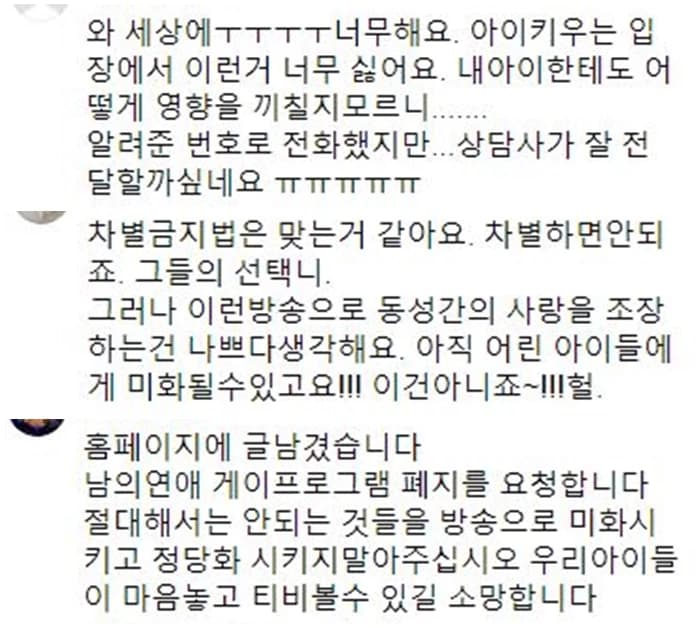 網友紛紛留言表達擔憂,「從養育孩子的立場來看,非常討厭。 不知道會對我的孩子產生怎樣的影響」、「不歧視,但是助長同性之間的愛情並不好」、「不管節目通過什麼途徑都會暴露出來,真的只是短暫地看,就已經讓人的判斷變得模糊和混亂」、「不懂如何回答小孩,同性之間是否可以結婚」、「對於沒有確立性取向的兒童來說,教育非常重要,擔心受到節目影響而引發混亂」等等。