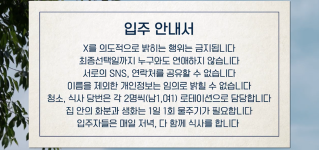 根據當時公開的入住指南,「禁止做出明示/公開 X(前任) 是誰的行為」,「直到最終選擇日為止,禁止與任何人戀愛」,「不能共享彼此的 SNS、聯繫方式」,「不能任意公開除名字以外的個人信息」,「清掃、吃飯值班由各 2 名(一男一女)輪流負責」,「家裏的花盆和鮮花需要每天澆一次水」,「入住者們每天晚上都一起吃飯」等規定。
