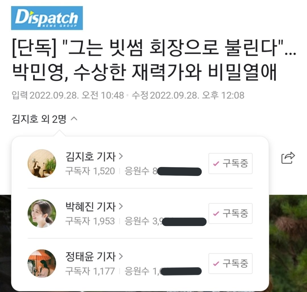 演員朴敏英戀情被D社曝光,歷時兩個月詳細調查男方底細,發現這位「神秘富豪」姜宗玄背景複雜,涉及經濟犯罪、與演藝圈和黑幫關係密切,引起了不少網友粉絲擔心,不禁問「朴敏英為何那樣」。戀情和男方身份曝光後,朴敏英新劇《月水金火木土》拍攝氣氛也受到影響。除此之外,網友為公開報導的三位D社女記者感到擔憂,呼籲保護她們的安全。