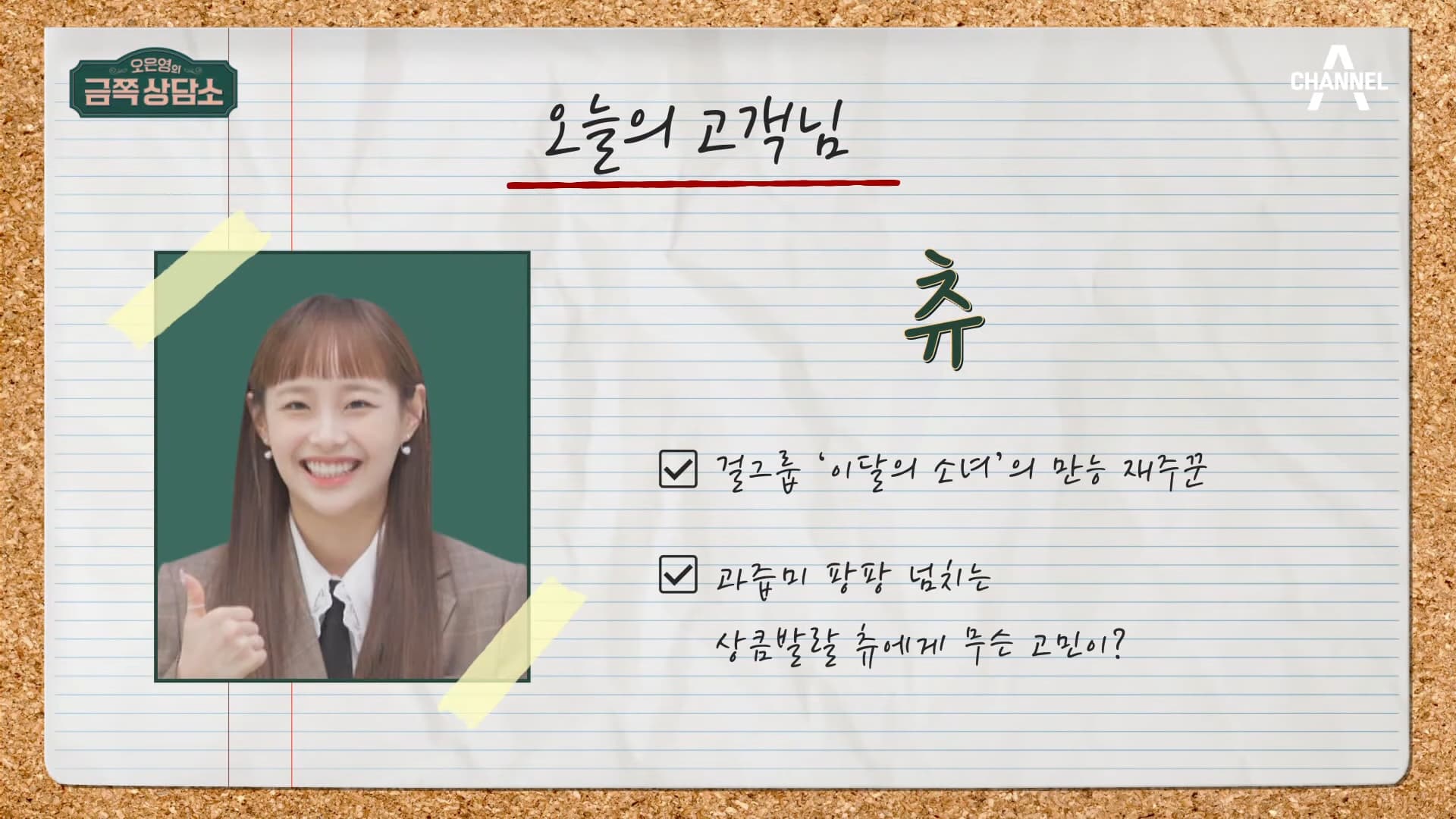 本月少女 Chuu 一直在鏡頭前都是位開朗少女,最近她出演《吳恩英的金牌諮詢所》講述自己透過暴食辣的食物減壓,導致身體出現問題。而開朗也成為了 Chuu 的包袱,讓她不願在大家表現負面情緒,只想在展現開心的一面。節目也透露因為重大的煩惱與家人討論,結果只得到回應「忍忍吧」,但最後因為太累、太傷心,曾與家人斷絕聯繫。