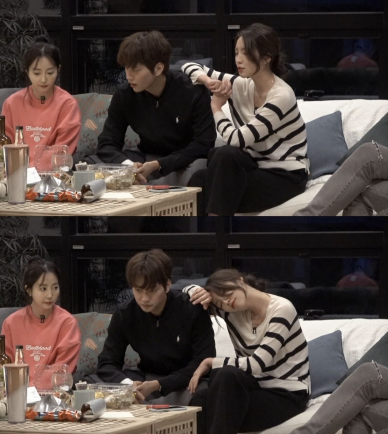 當日節目,大家晚上聚在一起喝酒玩遊戲,海恩與賢圭緊黏著彼此、並排坐,期間海恩似乎喝醉了,主動牽住賢圭的手,甚至進一步十指交扣,不僅如此,在聊天過程中,海恩還把頭靠在賢圭的肩上,大笑時也拍打著男方的膝蓋,關係看起來很親密。