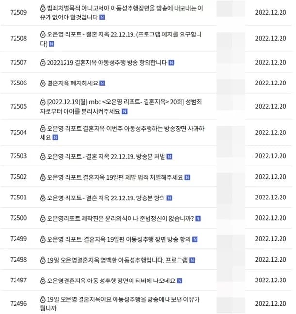 MBC 綜藝《結婚地獄》由吳恩英博士觀察和分析已婚夫婦日常生活,為他們之間的衝突、擔憂給出建議。在 19 日播出的最新一期節目中,播出初婚丈夫和再婚妻子組建家庭,因 7 歲女兒(繼女)的養育觀而發生衝突。節目播出後,因為繼父與繼女的肢體接觸,引起了猥褻兒童爭議。隨著爭議擴大,MBC 決定刪除相關爭議片段。