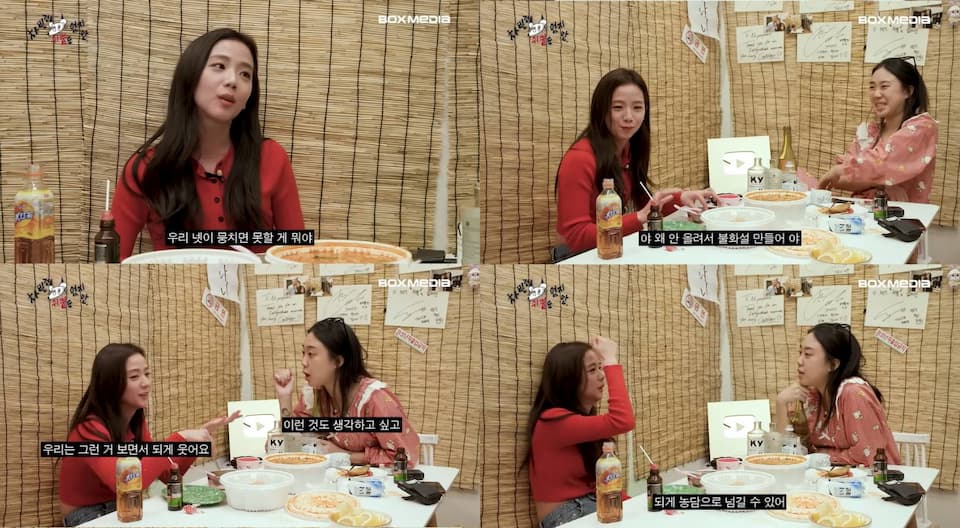 《雖然沒準備什麼菜》邀請明星藝人以喝酒談天的方式,讓他們酒後吐真言,屢屢引發話題討論。面對先前曾鬧得沸沸揚揚的成員不合傳聞,Jisoo 在節目中小酌一番後大方回應,「當我們看到這些都邊看邊笑,噗哈哈這樣」。