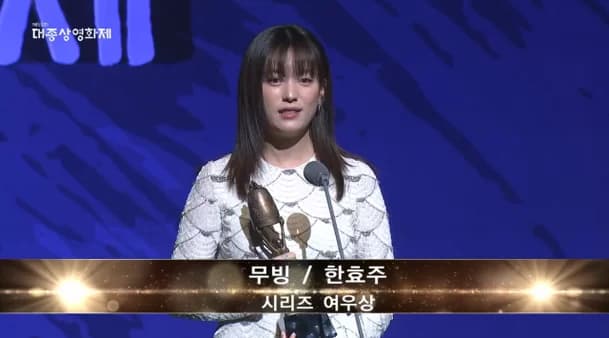 第 59 屆大鐘獎電影節在今(15)晚舉行頒獎禮,並由車仁杓與張度練擔任主持人。在《Moving 異能》中憑藉飾演超能力者李美賢、「奉皙媽媽」一角,獲得好評的演員韓孝珠,在當晚撃敗強敵《黑暗榮耀》宋慧喬,抱走電視劇部門最佳女主角獎。