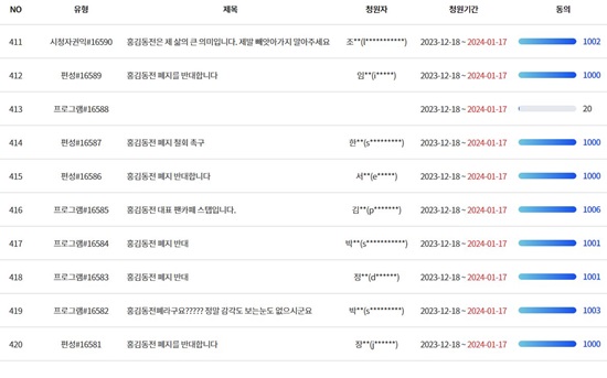 隨著在社群平台、OTT 人氣很高的《洪金銅錢》廢除消息傳出,KBS 官網連出現很多「反對廢除」的請願文章,至今(22)日已上傳 400 多篇。甚至有觀眾在今日發起卡車示威抗議,卡車上寫著「觀眾將扭轉廢除洪金銅錢的命運」、「反對廢除洪金銅錢」、「現在是 21 世紀了,還根據舊時代的材料數據來評價節目」、「OTT 同時段第一」、「觀眾的民意在這裡,而不是收視率」。