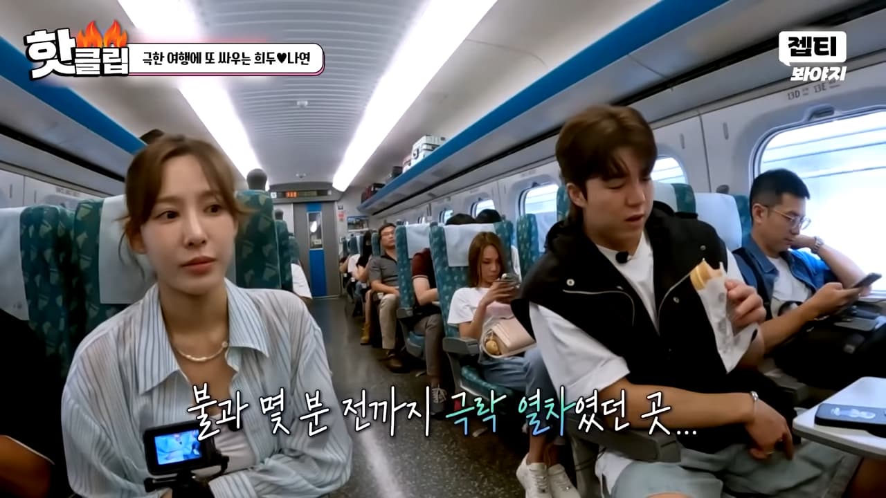 有網友在社群分享兩段影片,其中一段是他們坐高鐵前往露營地,開頭都有說有笑相當甜蜜,期間有服務員用英文問他們「是在拍攝 YT 嗎?」,李娜妍回答「It’s broadcast.(這是電視節目),南熙斗則說是 YTR,然後兩人為是否在 YT 播出鬥嘴。
