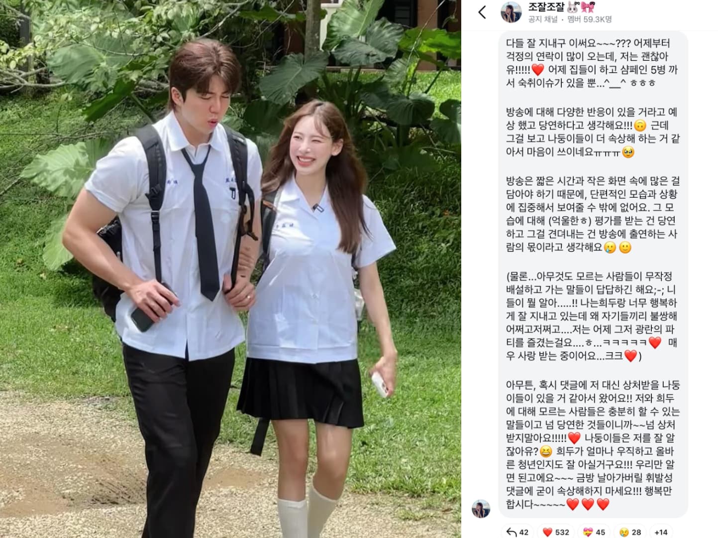 李娜妍知道節目引起討論後,她上傳長文為男友澄清,大家過度解讀讓她心情鬱悶。實際上,她與熙斗過得非常幸福,熙斗也是個憨厚正直的青年,粉絲們應該很清楚,只要我們知道就行了,讓我們幸福吧。
