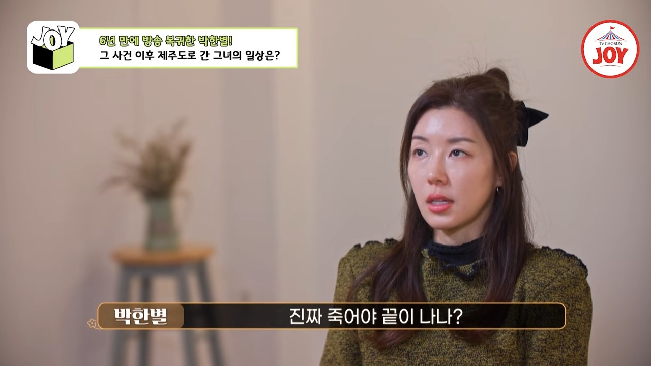 朴韓星聊到當時事件的感受,當時全國上下都在討論她,她能做的事情一點都沒有,「感覺就像不是現實一樣,真的要死了才能結束嗎?這個想法在我心中盤旋。死了才能結束,幾乎睡不著覺,但還是得拍攝,真的很痛苦」,坦承擔心是否能夠復出,「因為是丈夫的事情,作為妻子我感到共同的責任,心情非常沉重,這樣出現在節目中本身就讓我非常擔心和害怕,因為我感到抱歉」。