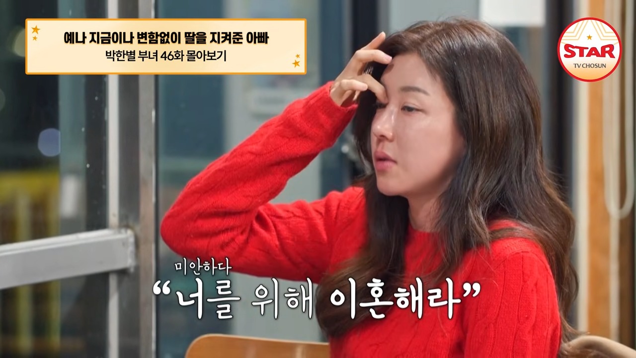 朴韓星透露周圍人不斷勸她離婚,連婆婆都哭著勸她,但她認為「孩子沒有任何錯,不能奪走家庭。作為母親,我做出了最好的選擇」,忍不住流下淚水接著解釋,「我為了我珍視的家庭,做出這種選擇的理由,孩子們現在可能不知道,但以後長大後肯定會感受到的」。