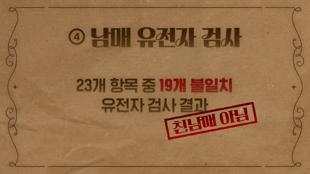 製作組更直接進行 DNA 親子鑑定實驗,採集兩人頭髮與口腔黏膜進行檢測,結果顯示 23 個比對項目中有 19 個不一致,證實兩人並非親兄妹。韓佳人聽完忍不住笑說:「雖然我早知道啦,但結果出來還是有點好笑」。製作組並沒有就此停止,最後還預告下集,帶著金桐俊的照片找命理師幫忙看相,看看臉相是不是也一樣像!