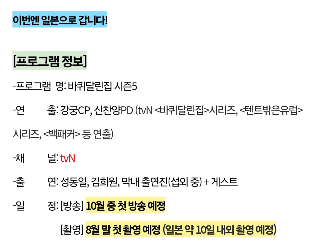 雖然報導稱「拍攝地點未定」,但社群率先爆料,第 5 季將首度前往海外拍攝,地點選定日本。節目延續「二老一小」設定,成東鎰、金希沅續任固定班底,忙內成員和嘉賓尚在邀請中。拍攝預計 8 月底開拍、拍攝為期約 10 天,並於 10 月中旬播出。