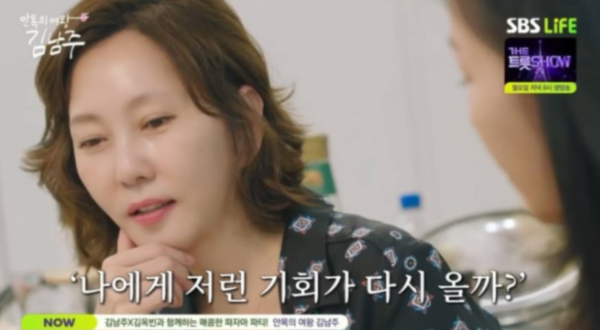 金南珠談到婚姻、育兒帶來的空白期,坦言結婚生子後有段時間心裡相當忐忑:「看頒獎典禮時,會想『我還能再站上那個舞台嗎?』心裡很酸楚」。她透露,2008 年生下小女兒後,隔年以電視劇《賢內助女王》回歸,並獲得 MBC 最優秀演技賞。當時的得獎感言,她就說過:「我真的懷疑自己還能否再次回到這個位置」。