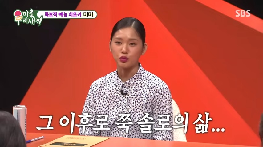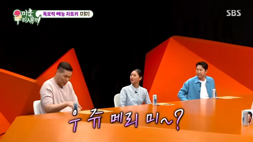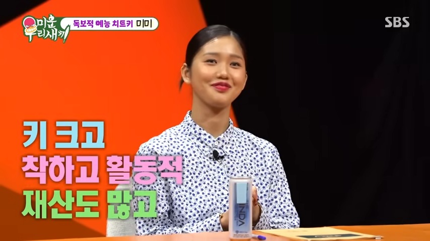 談到理想型時,Mimi 具體列出條件,表示自己喜歡「個子高、善良、活潑、有錢、喜歡運動,而且值得我學習的人,最重要的是不能有口臭的男人」,逗得全場大笑。主持人申東燁聽後激動回應:「這裡就有一個符合條件的人!」,並指向徐章勳。Mimi 驚訝地喊「喔!」,還開玩笑對他求婚:「Would you marry me?(要跟我結婚嗎?)」,瞬間引爆笑聲。