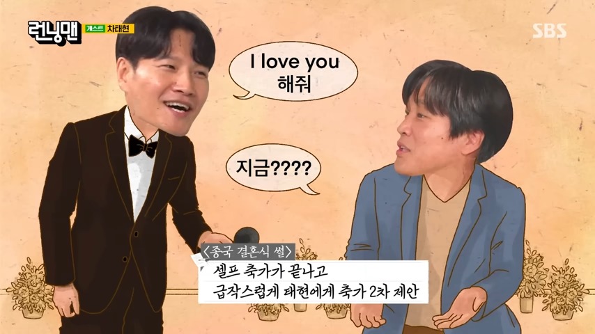 車太鉉在節目中透露,原本婚禮上的祝歌由金鍾國親自與樂隊演唱〈討人喜愛〉,沒想到唱完後,新郎又臨時指定,請他加唱〈I Love You〉,讓他意外成了祝歌歌手。他還笑說,婚禮上遇見金鍾國的母親,連說三次「恭喜您」,對方卻僅冷淡回應「啊、是…」或「啊、好啊」,讓他一度懷疑自己平常散播太多謠言,惹得長輩記恨,引發爆笑。