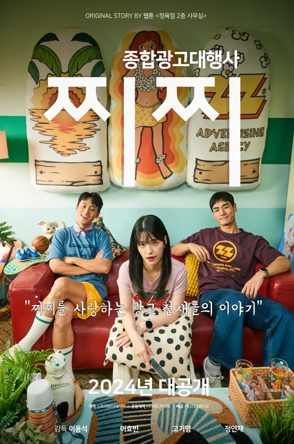 《綜合廣告代理公司:奶奶》改編自網漫《肉店二樓辦公室》,內容講述三位主角創業失敗後,搬進狹小又破舊的「貨櫃屋」繼續苟延殘喘,各自去尋找就業之路。抱著被弄得髒黃的矽膠枕頭,發呆地躺著的「容植」:「這矽膠枕頭的柔軟觸感……就像女人的胸部(찌찌/CHICHI)一樣啊!」。