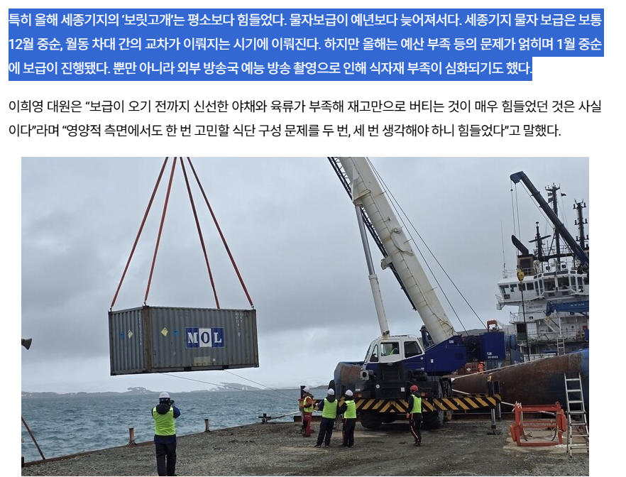 基地隊長李亨根則解釋:「這批食材是從韓國購入後,已經存放了一年半」。總務權泳勳補充:「原本應該在 12 月初有補給船抵達,但今年要延到明年 1 月,只能靠現有食材撐兩個月」。他也表示:「這段時間要用這些食材料理真的不容易」。