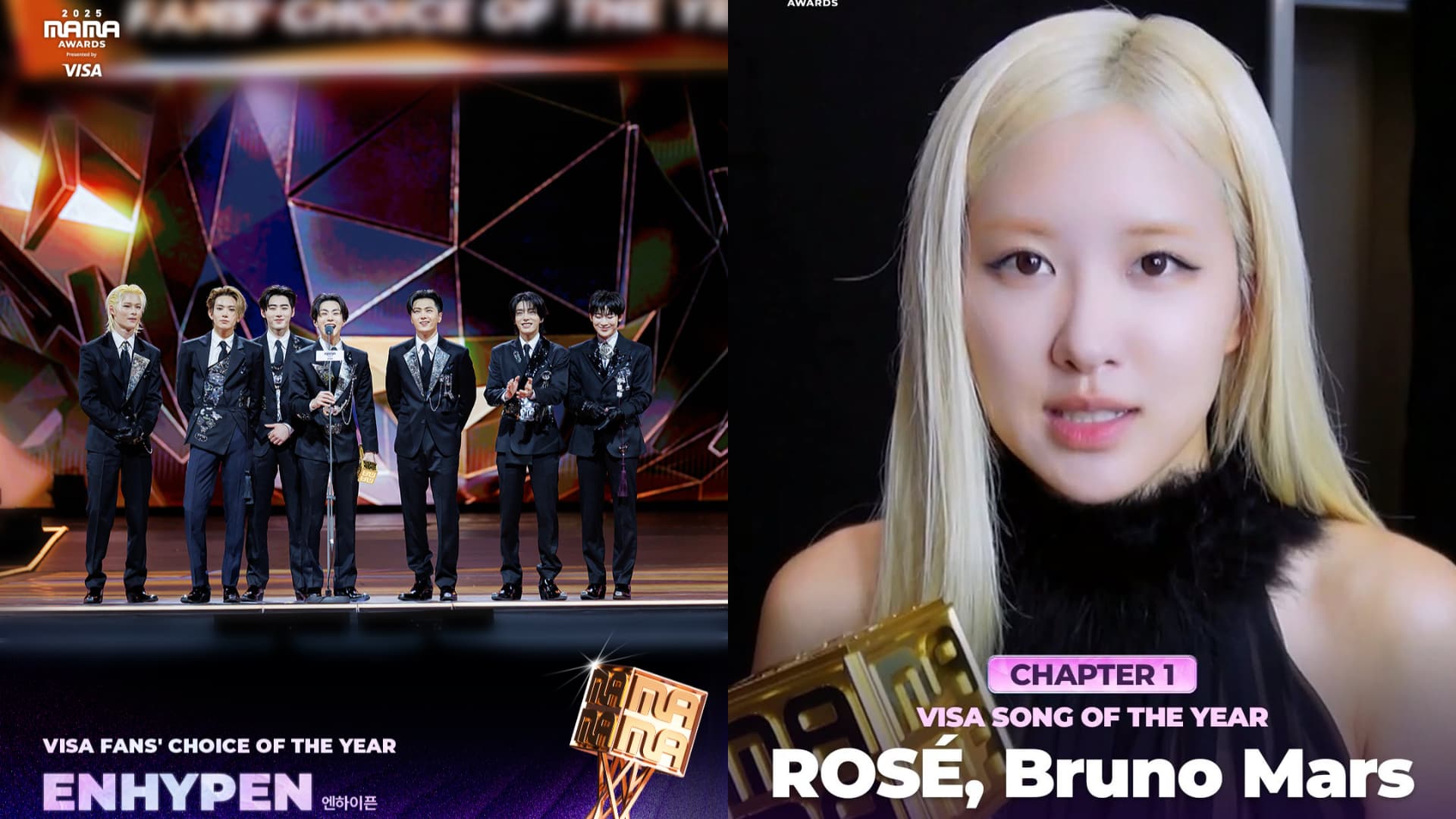 《2025 MAMA》第一章於 28 日在香港啟德體育館舉行,在嚴肅莊重的氣氛下揭開帷幕。人氣男團 ENHYPEN 與 BLACKPINK Rosé 分別奪下「年度粉絲之選」與「年度歌曲」兩項大賞。