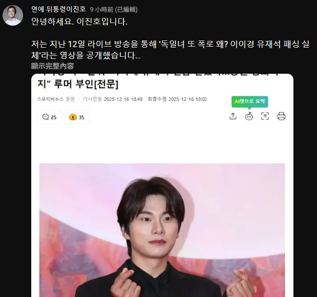 李鎮浩在個人頻道發表長文,透露看到李伊庚所屬社否認懷疑劉在錫的官方聲明後,感到「極度震驚」,直言:「確認過採訪內容的所屬公司,竟會發出這樣的聲明,完全出乎意料」。他透露自己在得知「李伊庚提到劉在錫」的內容後,因難以置信還特地再次致電核實,「既然有明確的資料與證據,實在無法理解為何公司會出面否認」。