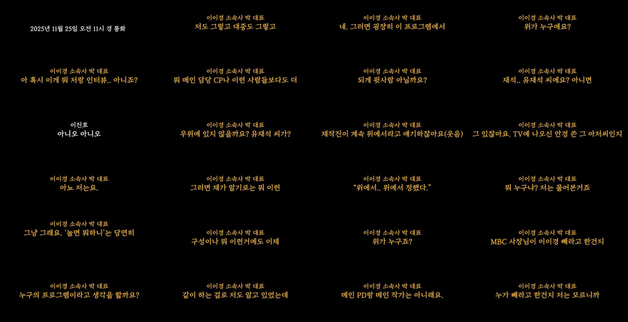 他還補充:「製作組當時說是『上面的決定』,但誰是上面?主作家甚至說『代表,現在是上面已經全部定案,沒有改變空間』,所以我才問『那上面是誰?是劉在錫嗎?』,畢竟我們也不清楚是不是 MBC 高層下的指示」。
