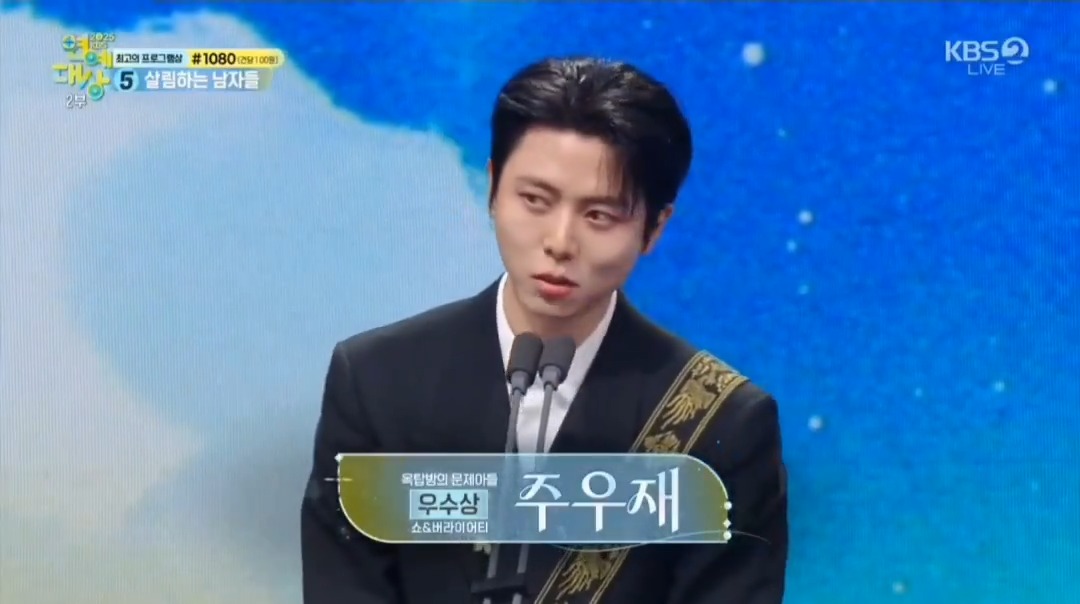 朱宇宰憑藉《屋塔房的問題兒童們》拿下「優秀賞」,感性致詞:「兩年前也得過一次獎,當時哭太慘沒說好感言。真的很感謝觀眾和製作組的愛。雖然我愛所有的出演成員,但我會把這個獎看作是與在前輩們的氣勢中奮戰、努力撐起節目的梁世燦一起得到的榮譽」。