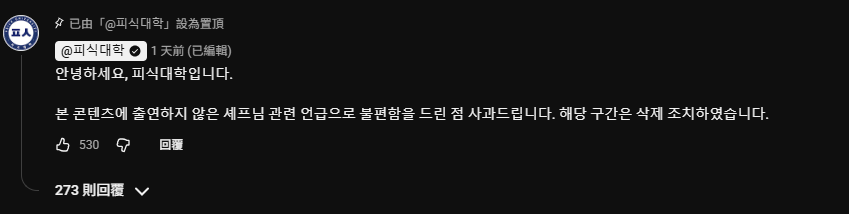 《Psick Univ》隨後在留言區發表聲明致歉,表示:「對於在內容中提及未出演的廚師,導致觀眾與當事人不適,深感抱歉」,並補充說明,原計畫立即刪除爭議片段,但因系統問題延遲,會盡快處理。事實上,該頻道先前就因性別歧視與地域歧視言論多次挨轟。這回金珉洙再度口出妄言,讓外界批評「根本沒學乖」,形象再度受損。