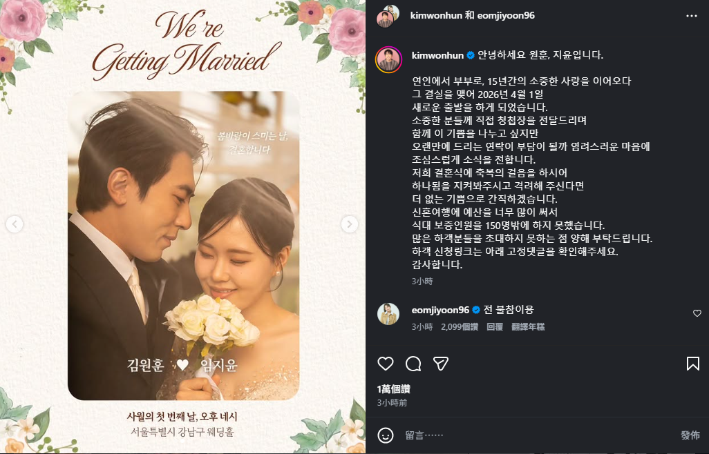 金元勳在社群發文寫道:「大家好,我們是元勳、智允。從戀人到夫妻,延續了 15 年的珍貴愛情,如今終於開花結果,將在 2026 年 4 月 1 日展開新的出發」。語氣看似誠懇動人,還表示希望能親自遞送喜帖給重要的人,一起分享喜悅。