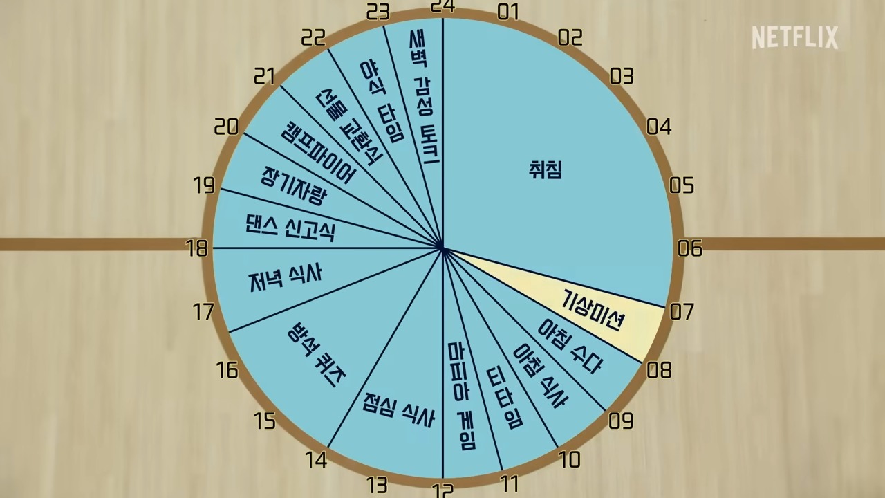 睡覺→ 起床任務→ 晨聊→早餐時間→ Tea Time → 黑手黨遊戲(團體破冰遊戲)→ 午餐→ 坐墊問答(腦力問答)→ 晚餐→舞蹈申告式 → 才藝表演→ 營火晚會→ 禮物交換→ 宵夜時間→ 深夜情感談話